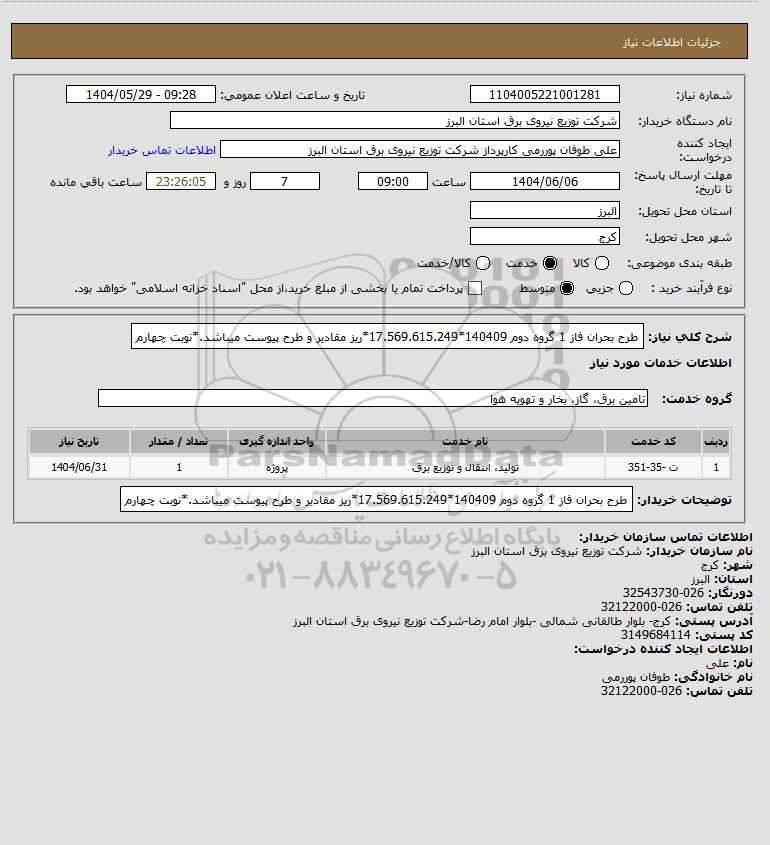 شرح کلی نیاز: طرح بحران فاز 1 گروه دوم 140409*17.569.615.249*ریز مقادیر و طرح پیوست میباشد.*نوبت چهارم