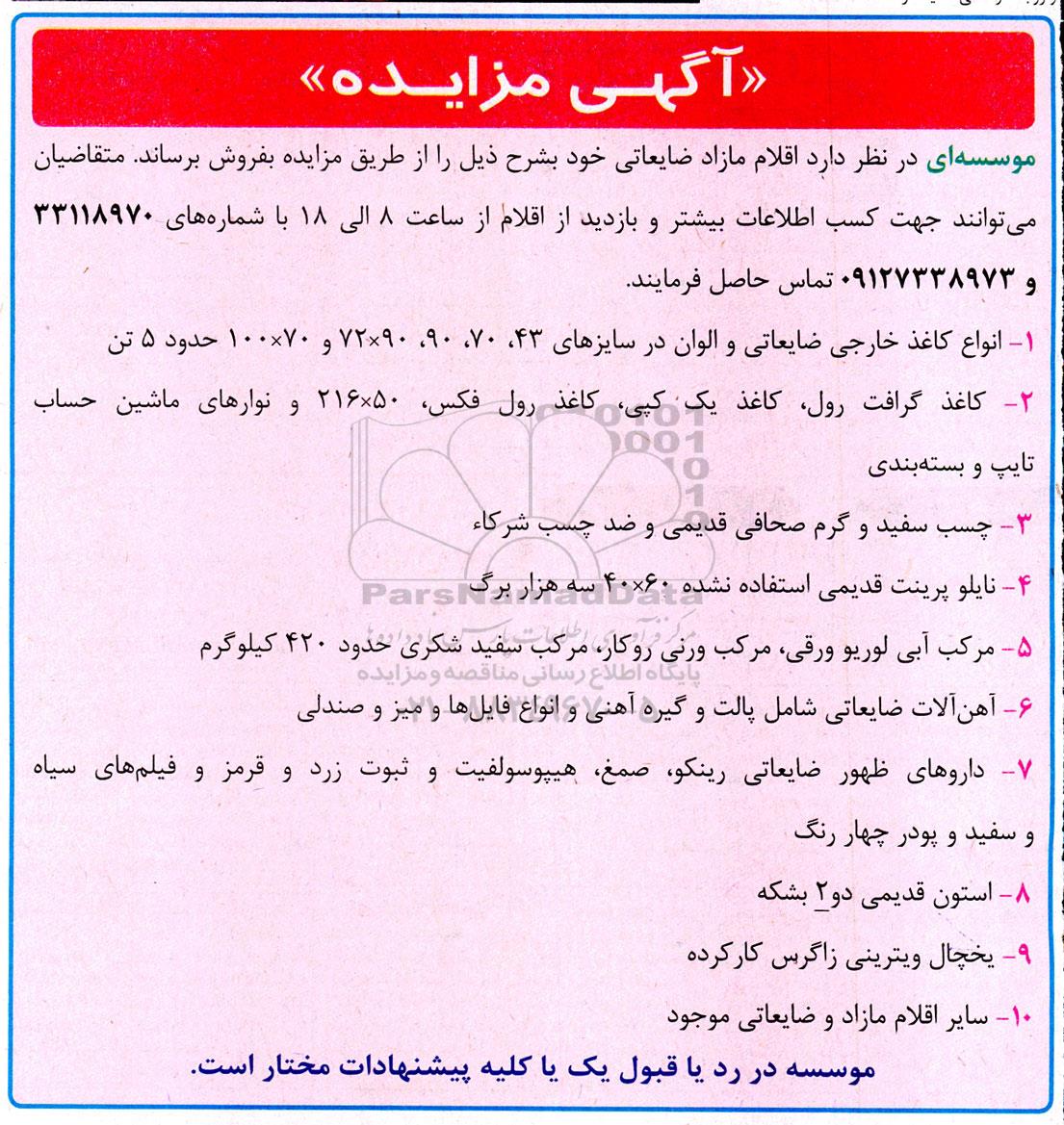 موسسه ای در نظر دارد اقلام مازاد ضایعاتی خود بشرح ذیل را از طریق مزایده بفروش برساند. متقاضیان میتوانند جهت کسب اطلاعات بیشتر و بازدید از اقلام از ساعت 8 الی 18 با شماره های 33118970 و 09127338973 تماس حاصل فرمایند.