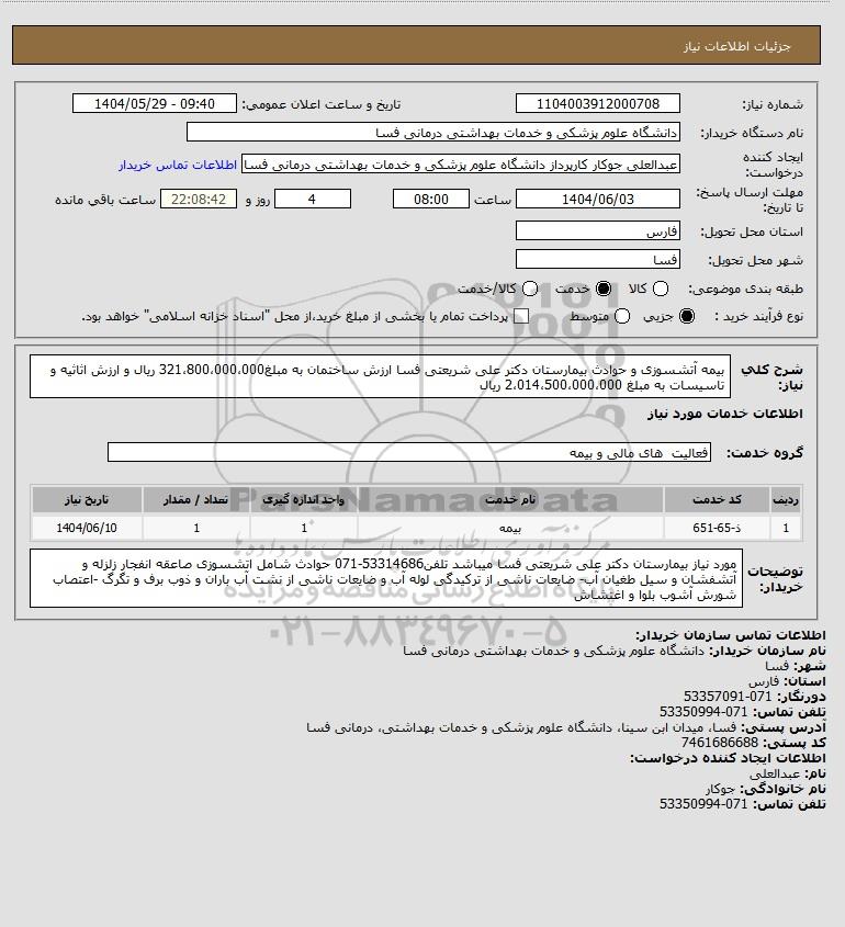 شرح کلی نیاز: بیمه آتشسوزی و حوادث بیمارستان دکتر علی شریعتی فسا
