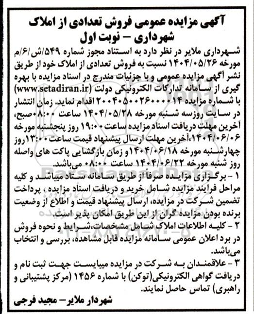 شهرداری ملایر در نظر دارد به استناد مجوز شماره 549.ش.6.م مورخه 1404.05.26 نسبت به فروش تعدادی از املاک خود از طریق نشر آگهی مزایده عمومی و با جزئیات مندرج در اسناد مزایده با بهره گیری از سامانه تدارکات الکترونیکی دولت ستاد ایران با شماره مزایده 2004050026000014 اقدام نماید. زمان انتشار در سایت روزسه شنبه مورخه 1404.05.28 ساعت 08:00 صبحآخرین مهلت دریافت اسناد مزایده ساعت 19:00 روز پنجشنبه مورخه 1404.06.06، آخرین مهلت ارسال پیشنهاد قیمت ساعت 13:00 روز چهارشنبه مورخه 1404.06.18 و زمان بازگشایی پاکت های واصله روز شنبه مورخه 1404.06.22 ساعت 08:00 میباشد.