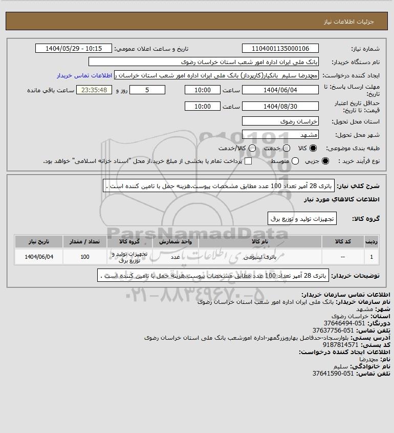 | 1 | -- | باتری لیتیومی | عدد | تجهیزات تولید و توزیع برق | 100 | 1404/06/04 |