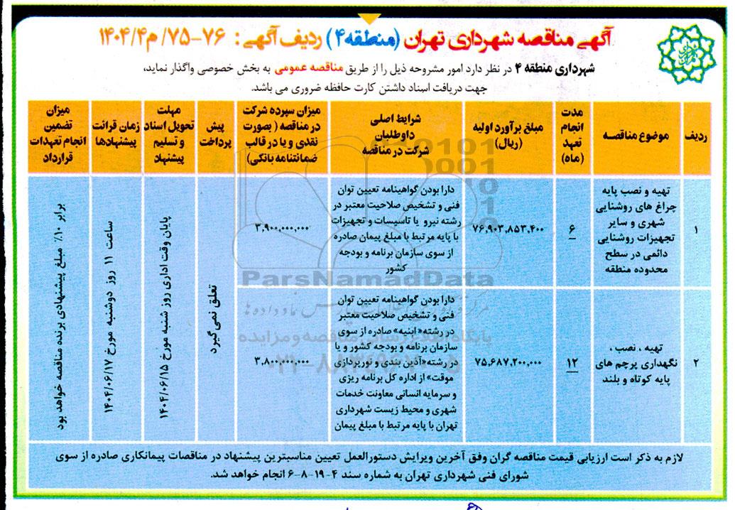 آگهی مناقصه شهرداری تهران (منطقه 4) ردیف آگهی: 76 - 75/م 1404/4