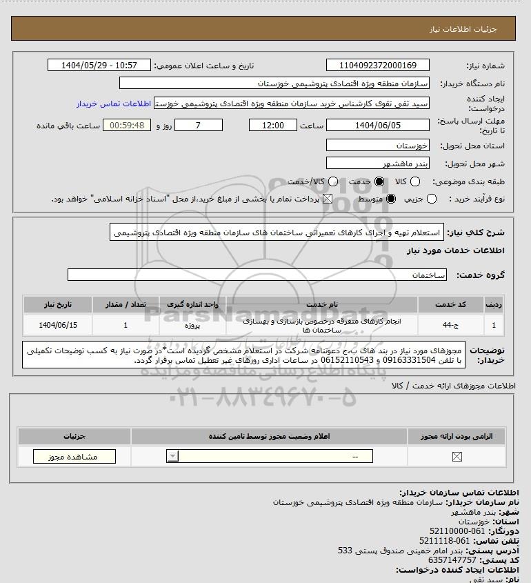 شرح کلی نیاز: استعلام تهیه و اجرای کارهای تعمیراتی ساختمان های سازمان منطقه ویژه اقتصادی پتروشیمی