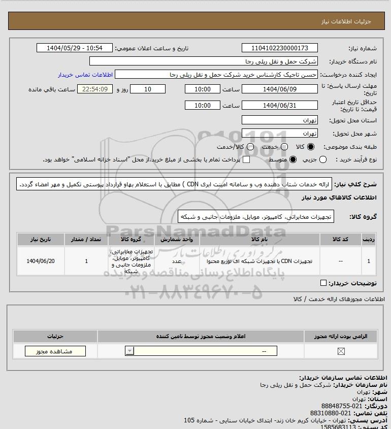 | 1 | -- | تجهیزات CDN یا تجهیزات شبکه ای توزیع محتوا | عدد | تجهیزات مخابراتی، کامپیوتر، موبایل، ملزومات جانبی و شبکه | 1 | 1404/06/20 |