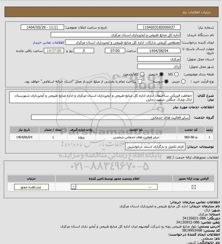 شرح کلی نیاز: حفاظت فیزیکی ساختمان اداری اداره کل منابع طبیعی و آبخیزداری استان مرکزی و اداره منابع طبیعی و آبخیزداری شهرستان اراک وپارک جنگلی شهید رجایی