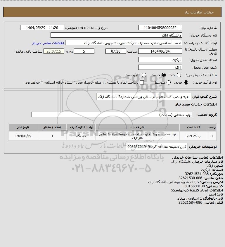 شرح کلی نیاز: تهیه و نصب کانال هواساز سالن ورزشی شماره2 دانشگاه اراک