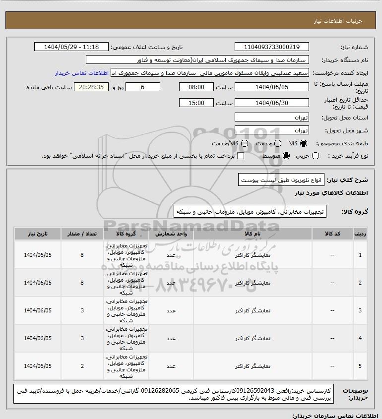شرح کلی نیاز: انواع تلویزیون طبق لیست پیوست