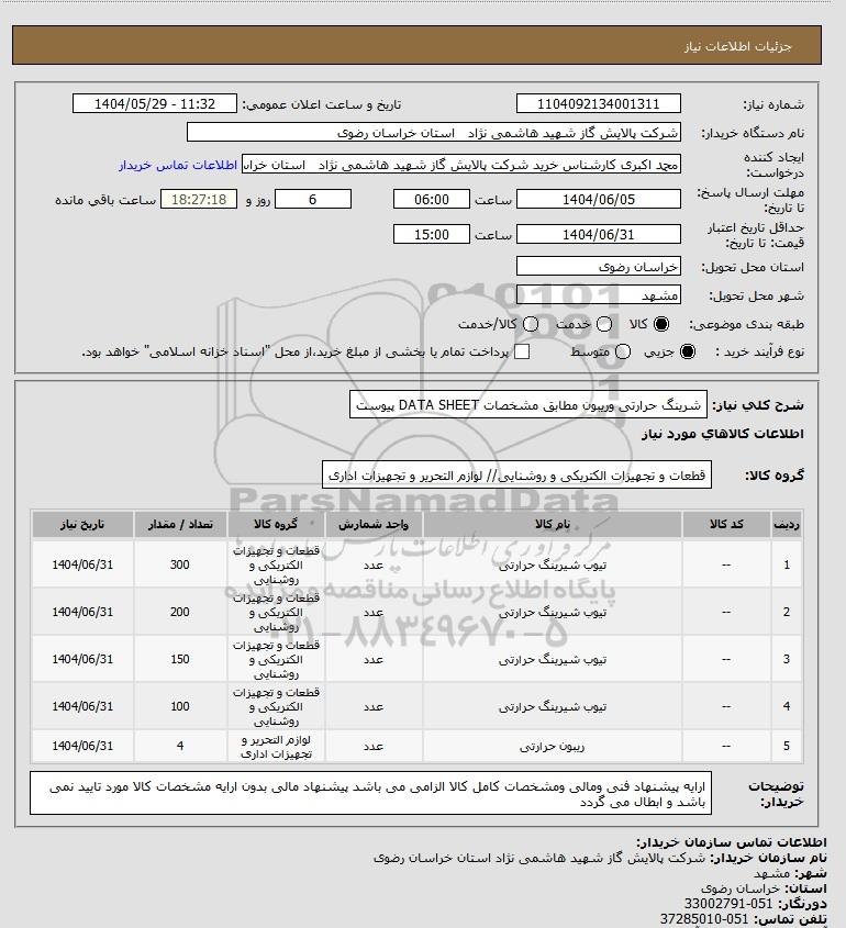 نام دستگاه خریدار:شرکت پالایش گاز شهید هاشمی نژاد استان خراسان رضوی