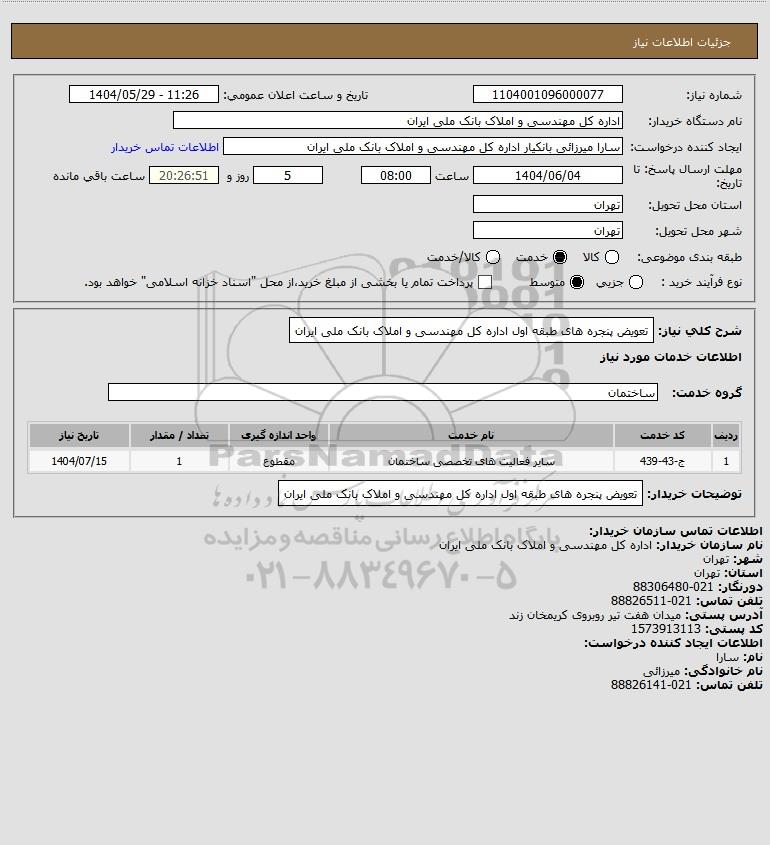 توضیحات خریدار:تعویض پنجره های طبقه اول اداره کل مهندسی و املاک بانک ملی ایران