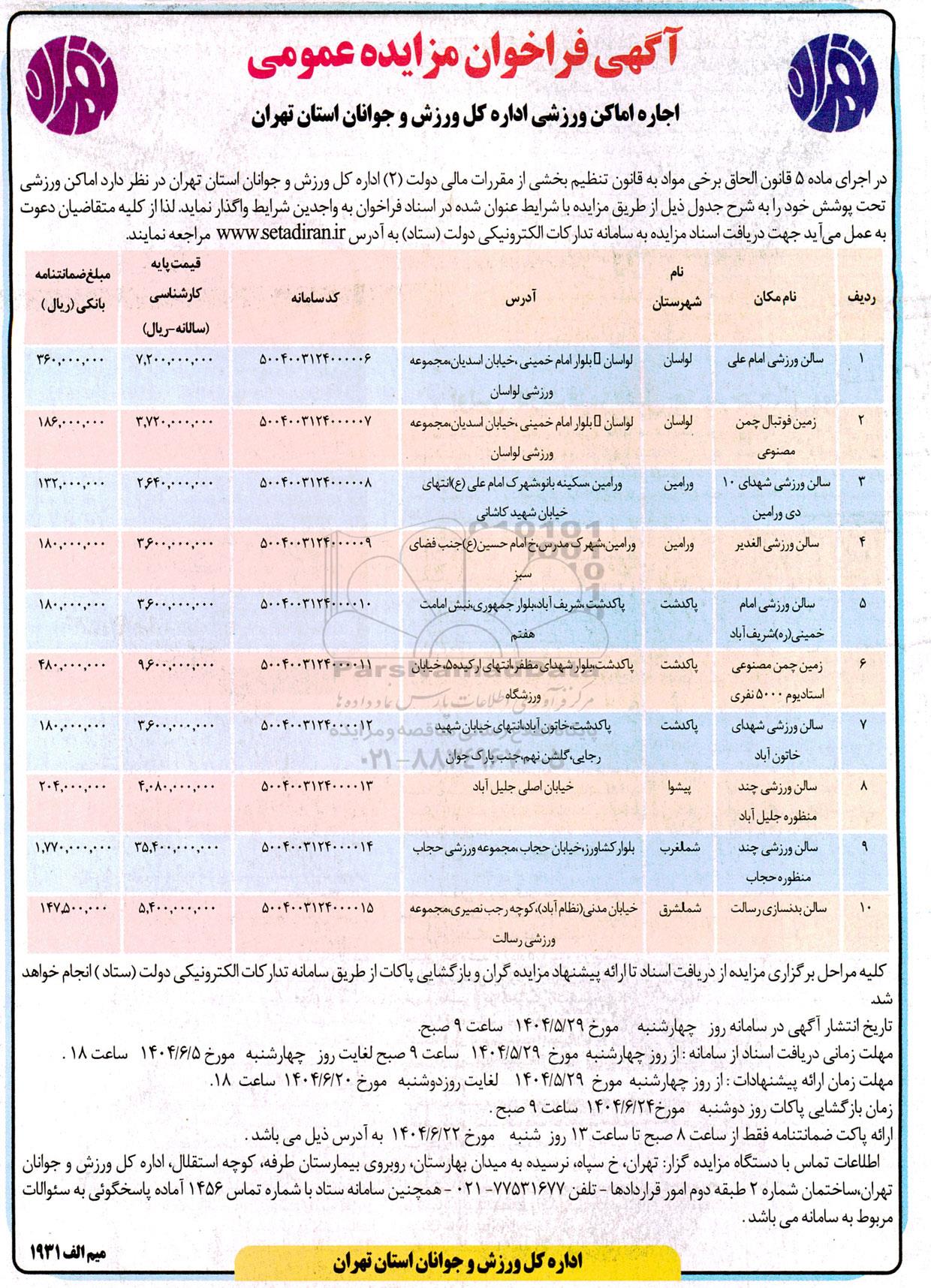 در اجرای ماده 5 قانون الحاق برخی مواد به قانون تنظیم بخشی از مقررات مالی دولت (2) اداره کل ورزش و جوانان استان تهران در نظر دارد اماکن ورزشی تحت پوشش خود را به شرح جدول ذیل از طریق مزایده با شرایط عنوان شده در اسناد فراخوان به واجدین شرایط واگذار نماید لذا از کلیه متقاضیان دعوت به عمل می آید جهت دریافت اسناد مزایده به سامانه تدارکات الکترونیکی دولت ستاد ایران مراجعه نمایند.