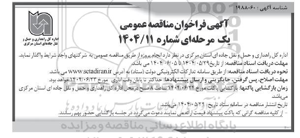 اداره کل راهداری و حمل و نقل جاده ای استان مرکزی در نظر دارد انجام پروژه از طریق مناقصه عمومی به شرکتهای واحد شرایط واگذار نماید.