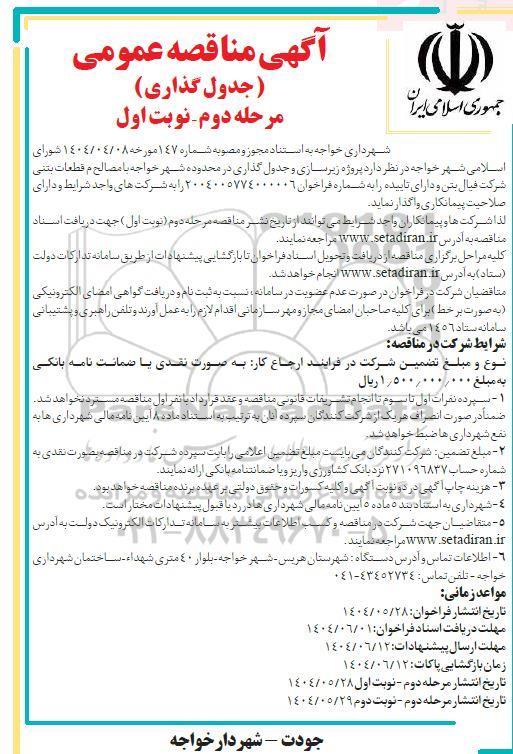 شهرداری خواجه به استناد مجوز و مصوبه شماره 147 مورخه 1404.4.8 شورای اسلامی شهر خواجه در نظر دارد پروژه زیرسازی و جدول گذاری در محدوده شهر خواجه با مصالح م قطعات بتنی شرکت فیال بتن و دارای تاییده را به شماره فراخوان 2004005774000006 را به شرکت های واجد شرایط و دارای صلاحیت پیمانکاری واگذار نماید.