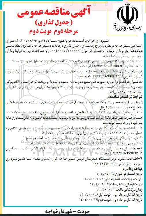 شهرداری خواجه به استناد مجوز و مصوبه شماره 147 مورخه 1404.4.8 شورای اسلامی شهر خواجه در نظر دارد پروژه زیرسازی و جدول گذاری در محدوده شهر خواجه با مصالح م قطعات بتنی شرکت فیال بتن و دارای تاییده را به شماره فراخوان 2004005774000006 را به شرکت های واجد شرایط و دارای صلاحیت پیمانکاری واگذار نماید.