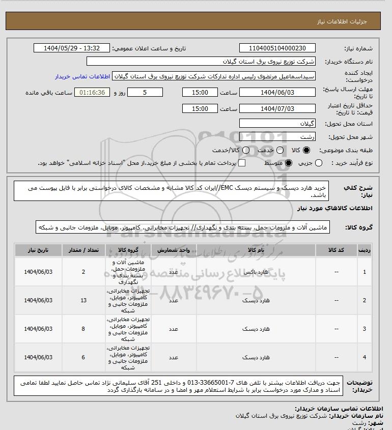 شرح کلی نیاز: خرید هارد دیسک و سیستم دیسک EMC//ایران کد کالا مشابه و مشخصات کالای درخواستی برابر با فایل پیوست می باشد.