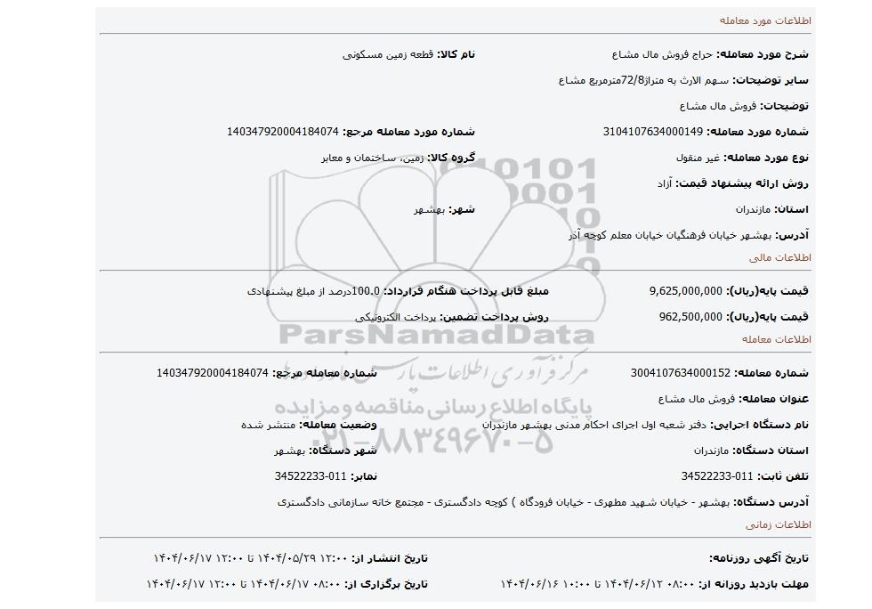 | شرح مورد معامله: حراج فروش مال مشاع | نام کالا: قطعه زمین مسکونی | |