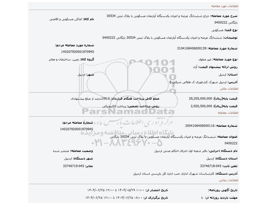 شرح مورد معامله: حراج ششدانگ عرصه و اعیان یکدستگاه آپارتمان مسکونی با پلاک ثبتی 30534 بایگانی 0400222 | نام کالا: اماکن مسکونی و اقامتی | |