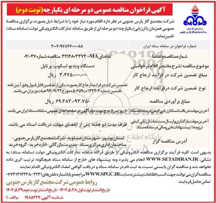 شرکت مجتمع گاز پارس جنوبی در نظر دارد اقلام مورد نیاز خود را با شرایط ذیل بصورت برگزاری مناقصه عمومی دو مرحله ای از طریق سامانه تدارکات الکترونیکی دولت سامانه ستاد تامین نماید: