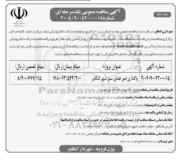 2004090042000015 | واگذاری امور فضای سبز شهر کنگاور | 168.013.542.300 | 8.400.677.115 | اعتبارات جاری |