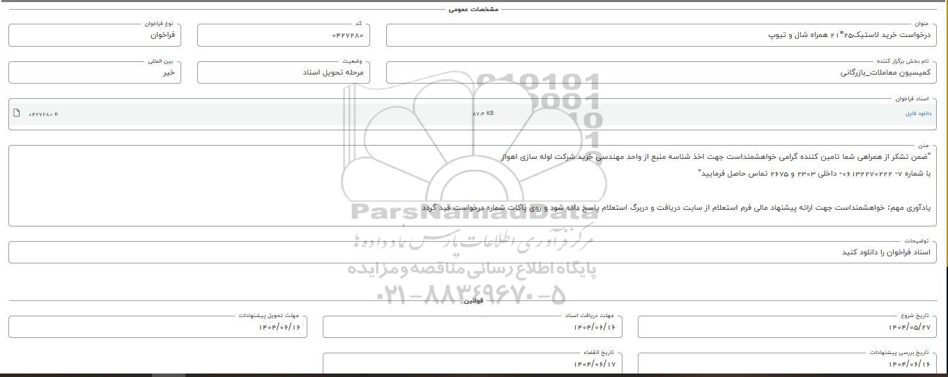 برای شرکت در مناقصه حتما از تصویر آگهی در سایت پارس نماد داده ها استفاده نمایید