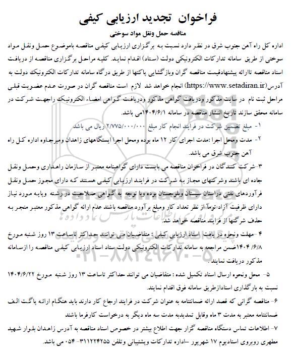 اداره کل راه آهن جنوب شرق در نظر دارد نسبت به برگزاری ارزیابی کیفی مناقصه با موضوع حمل و نقل مواد سوختی از طریق سامانه تدارکات الکترونیکی دولت (ستاد) اقدام نماید. کلیه مراحل برگزاری مناقصه از دریافت اسناد مناقصه تا ارائه پیشنهاد قیمت مناقصه گران و بازگشایی پاکتها از طریق درگاه سامانه تدارکات الکترونیک دولت به آدرس (ستاد ایران) انجام خواهد شد لازم است مناقصه گران در صورت عدم عضویت قبلی مراحل ثبت نام در سایت مذکور و دریافت گواهی مذکور و دریافت گواهی امضاء الکترونیک راجهت شرکت در سامانه محقق سازند تاریخ انتشار مناقصه در سامانه 1404.6.1 می باشد.