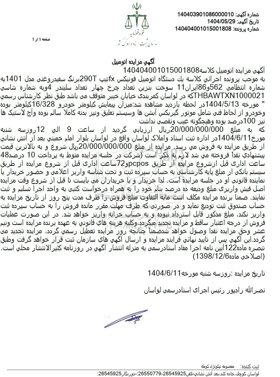 مزایده یک دستگاه اتومبیل فونیکس FX رنگ سفید کلاسه 140404001015001808