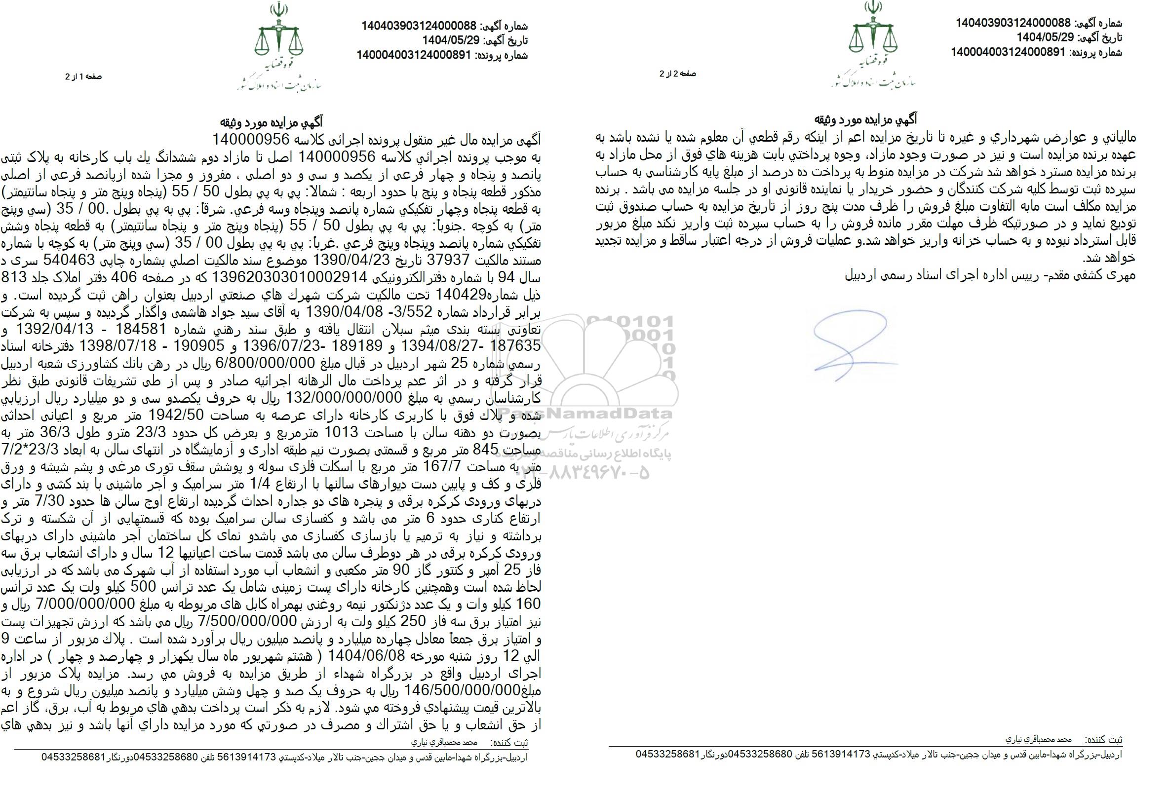 مزایده فروش ششدانگ یک باب کارخانه به پلاک ثبتی پانصد و پنجاه و چهار فرعی از یکصد و سی و دو اصلی، مفروز و مجزا شده از پانصد فرعی از اصلی مذکور قطعه پنجاه و پنج ، کاربری کارخانه ای دارای عرصه به مساحت 1942/50 متر مربع و اعیانی احداثی بصورت دو دهنه سالن با مساحت 1013 متر مربع و بعرض کل حدود 23/3 متر