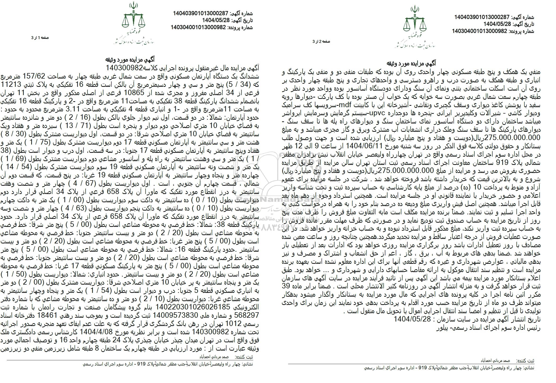 مزایده ششدانگ یک دستگاه آپارتمان مسکونی طبقه چهار به مساحت 157.62 متر مربع به پلاک ثبتی 11213 فرعی از 34 اصلی