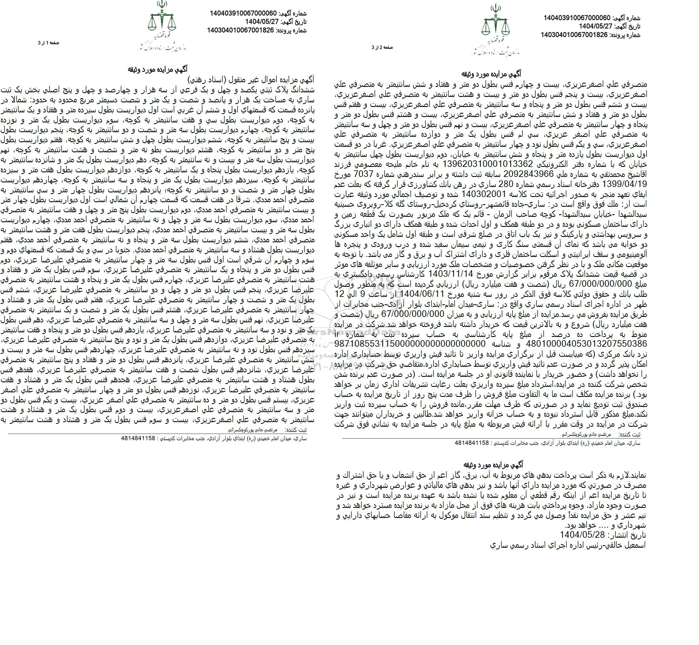مزایده فروش ششدانگ پلاک ثبتی یکصد و چهل و یک فرعی از سه هزار و چهارصد و چهل و پنج اصلی به مبلغ 67.000.000.000 ریال