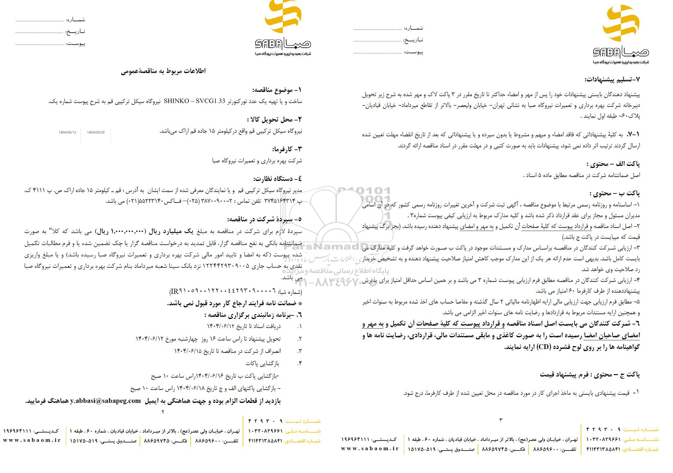 1. موضوع مناقصه: ساخت و یا تهیه یک عدد تورکنورتر SHINKO- SVCG1.33 نیروگاه سیکل ترکیبی قم