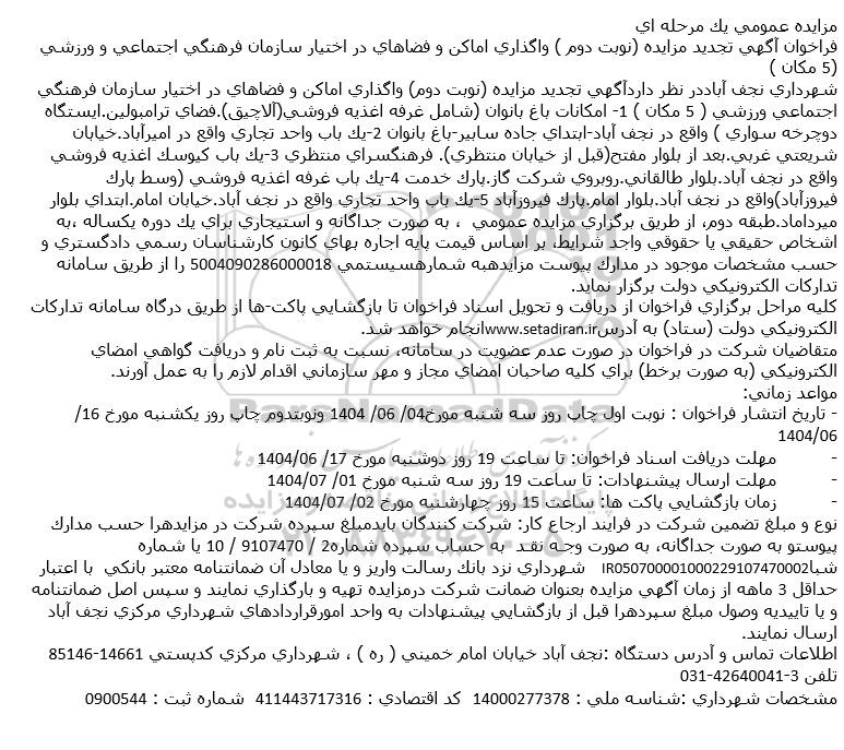 شهرداری نجف آباددر نظر داردآگهی تجدید مزایده (نوبت دوم) واگذاری اماکن و فضاهای در اختیار سازمان فرهنگی اجتماعی ورزشی ( 5 مکان ) 1- امکانات باغ بانوان (شامل غرفه اغذیه فروشی(آلاچیق).فضای ترامبولین.ایستگاه دوچرخه سواری ) واقع در نجف آباد-ابتدای جاده سابیر-باغ بانوان 2-یک باب واحد تجاری واقع در امیرآباد.خیابان شریعتی غربی.بعد از بلوار مفتح(قبل از خیابان منتظری). فرهنگسرای منتظری 3-یک باب کیوسک اغذیه فروشی واقع در نجف آباد.بلوار طالقانی.روبروی شرکت گاز.پارک خدمت 4-یک باب غرفه اغذیه فروشی (وسط پارک فیروزآباد)واقع در نجف آباد.بلوار امام.پارک فیروزآباد 5-یک باب واحد تجاری واقع در نجف آباد.خیابان امام.ابتدای بلوار میرداماد.طبقه دوم، از طریق برگزاری مزایده عمومی  ، به صورت جداگانه و استیجاری برای یک دوره یکساله ،به اشخاص حقیقی یا حقوقی واجد شرایط، بر اساس قیمت پایه اجاره بهای کانون کارشناسان رسمی دادگستری و حسب مشخصات موجود در مدارک پیوست مزایدهبه شمارهسیستمی 5004090286000018 را از طریق سامانه تدارکات الکترونیکی دولت برگزار نماید.