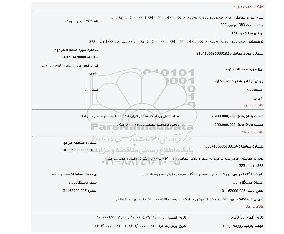 | عنوان معامله: خودرو سواری مزدا به شماره پلاک انتظامی 54 – 734 ل 77 به رنگ بژ روغنی و مدل ساخت 1383 و تیپ 323 | ||
