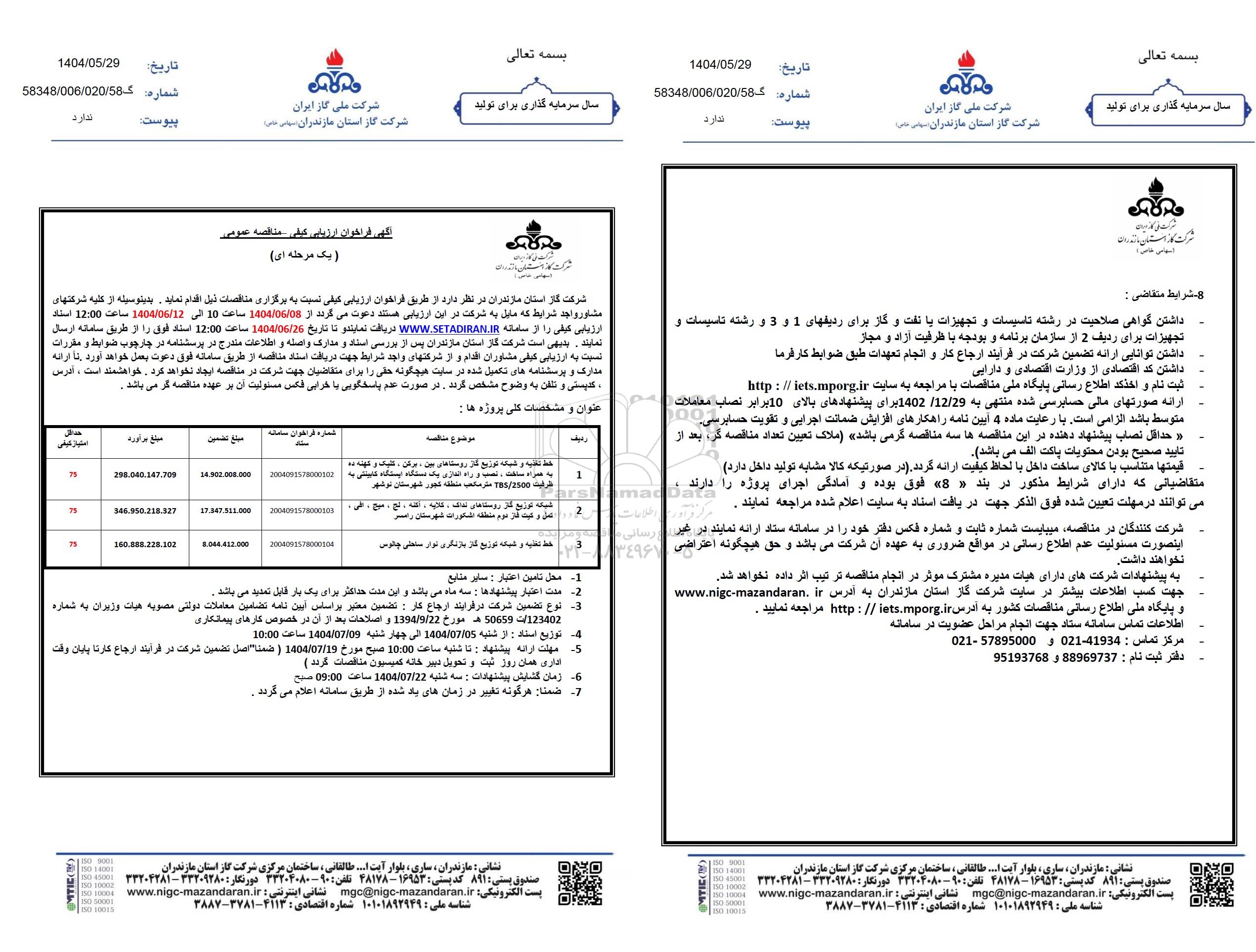 یک مرحله ای شرکت گاز استان مازندران در نظر دارد از طریق فراخوان ارزیابی کیفی نسبت به برگزاری مناقصات ذیل اقدام نمايد. بدینوسیله از کلیه شرکتهای مشاور واجد شرایط که مایل به شرکت در این ارزیابی هستند دعوت میگردد از 1404.6.8 ساعت 10 الى 1404.6.12 ساعت 12:00 استاد ارزیابی کیفی را از سامانه سایت ستاد ایران دریافت نمایند و تا تاریخ 1404.6.26 ساعت 12:00 استاد فوق را از طریق سامانه ارسال نمایند. بدیهی است شرکت گاز استان مازندران پس از بررسی استاد و مدارک واصله و اطلاعات مندرج در پرسشنامه در چارچوب ضوابط و مقررات نسبت به ارزیابی کیفی مشاوران اقدام و از شرکتهای واجد شرایط جهت دریافت اسناد مناقصه از طریق سامانه فوق دعوت بعمل خواهد آورد تا ارائه مدارک و پرسشنامه های تکمیل شده در سایت هیچگونه حلی را برای متقاضیان جهت شرکت در مناقصه ایجاد نخواهد کرد . خواهشمند است ، آدرس کدیستی و تلفن به وضوح مشخص گردد. در صورت عدم پاسخگویی با خرابی فکس مسئولیت آن بر عهده مناقصه گر می باشد.