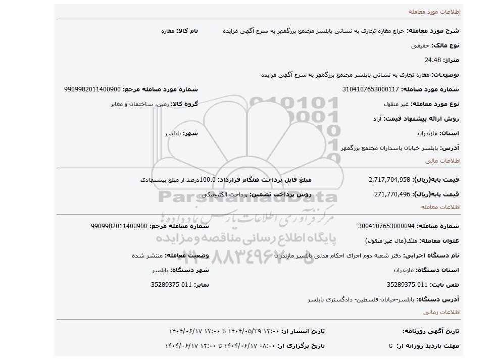 مزایده عمومی مزایده مغازه تجاری به نشانی بابلسر مجتمع بزرگمهر به شرح آگهی مزایده برگزار میگردد. از کلیه افراد متخصص و شرکتهای واجد شرایط دعوت به عمل میآید تا در این مزایده با کد خبرگزاری پارس نماد : 9438957 شرکت نمایند تاریخ شروع مزایده : 1404/05/29 مهلت شرکت در مزایده: تا پایان روز 1404/06/17