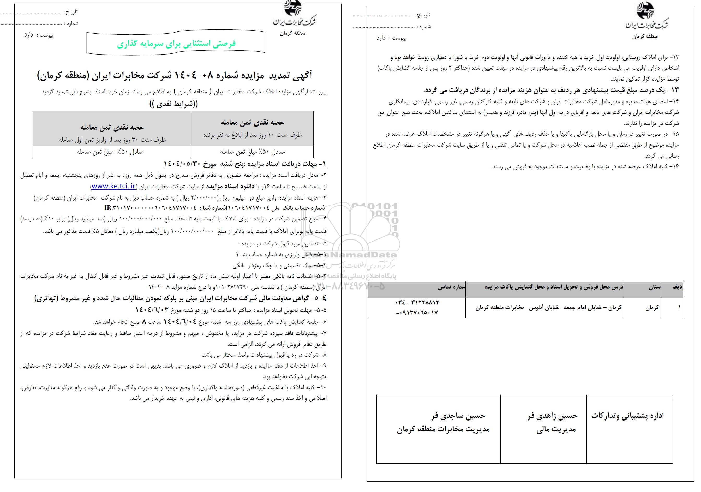 آگهی تمدید مزایده شماره 08- 1404 شرکت مخابرات ایران (منطقه کرمان)