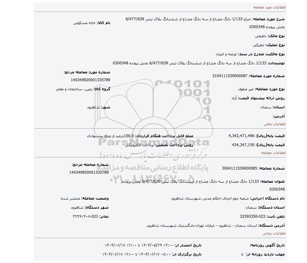 شرح مورد معامله: حراج 1/133 دانگ مشاع از سه دانگ مشاع از ششدانگ پلاک ثبتی 6/477/639 بخش پرونده 0300348 نام کالا: خانه مسکونی