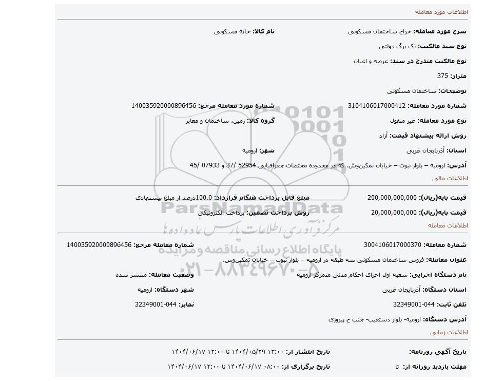 عنوان معامله: فروش ساختمان مسکونی سه طبقه در ارومیه – بلوار نبوت – خیابان تمکینوش، | ||