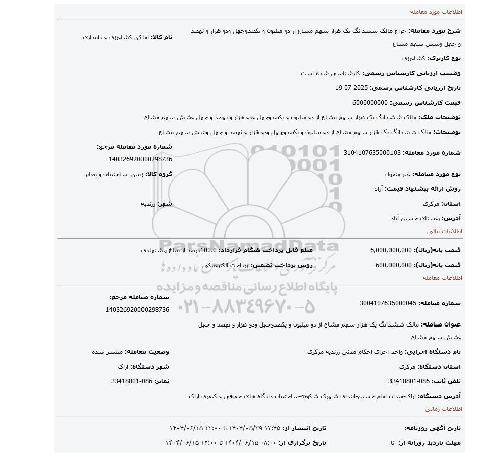 شماره معامله: 3004107635000045 | شماره معامله مرجع: 140326920000298736 | |