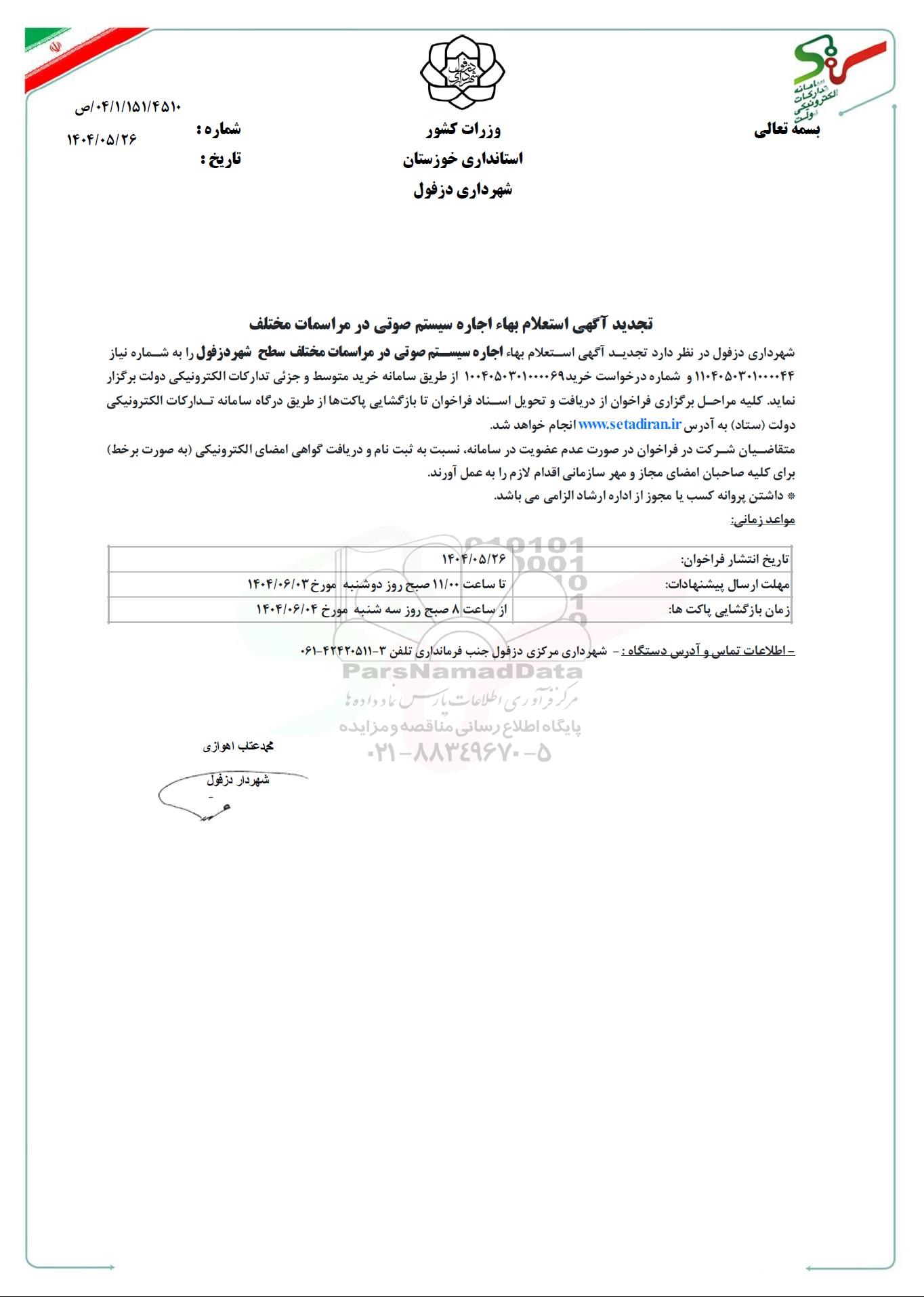 شهرداری دزفول در نظر دارد آگهی استعلام بها اجاره سیستم صوتی در مراسمات مختلف سطح شهر دزفول را به شماره نیاز 1104050301000044 و شماره درخواست خرید 1004050301000069 از طریق سامانه خرید متوسط و جزئی تدارکات الکترونیکی دولت برگزار نماید. کلیه مراحل برگزاری فراخوان از دریافت و تحویل اسناد فراخوان تا بازگشایی پاکتها از طریق درگاه سامانه تدارکات الکترونیکی دولت (ستاد) ایران انجام خواهد شد.