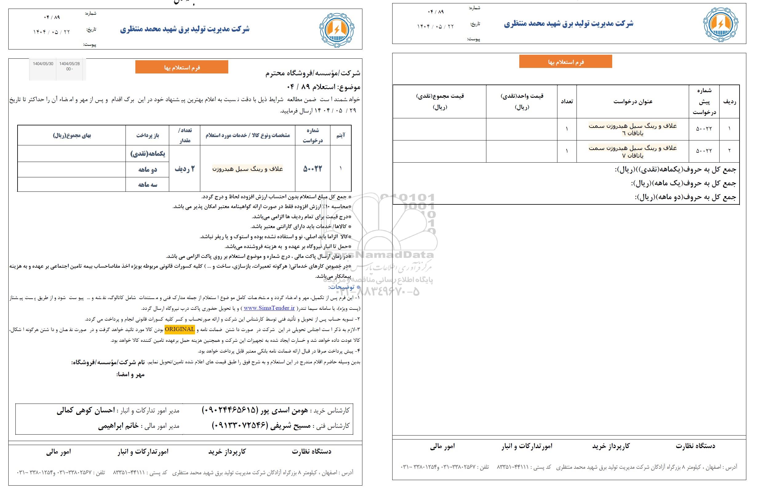 استعلام بها و موضوع استعلام استعلام غلاف و رینگ سیل هیدروژن به اطلاع کلیه شرکتها و افراد متخصص واجد شرایط میرساند، آگهی گذار در نظر دارد از طریق استعلام بها، نسبت به انتخاب و دریافت پیشنهادات اقدام نماید. این استعلام با کد آگهی ثبت شده در سامانه خبرگزاری پارس نماد : 9438999 منتشر شده است. مشخصات استعلام : تاریخ شروع استعلام: 1404/05/29 آخرین مهلت ارسال پیشنهاد قیمت : 1404/05/30 و محل اجرای پروژه : استان اصفهان میباشد. استعلام قیمت مورد درخواست : استعلام غلاف و رینگ سیل هیدروژن با دستهبندیهای تخصصی و گروه های مرتبط : قطعات لاستیکی, لوله و اتصالات, نیروگاه, تجهیزات برق و الکترونیک, استعلام اطلاع رسانی میگردد. شرایط شرکت در استعلام آنلاین : ابتدا ثبت نام در سامانه استعلام پارس نماد و تکمیل مدارک موردنیاز و بارگذاری در سامانه رعایت تمامی ضوابط و الزامات مندرج در اسناد استعلام است.