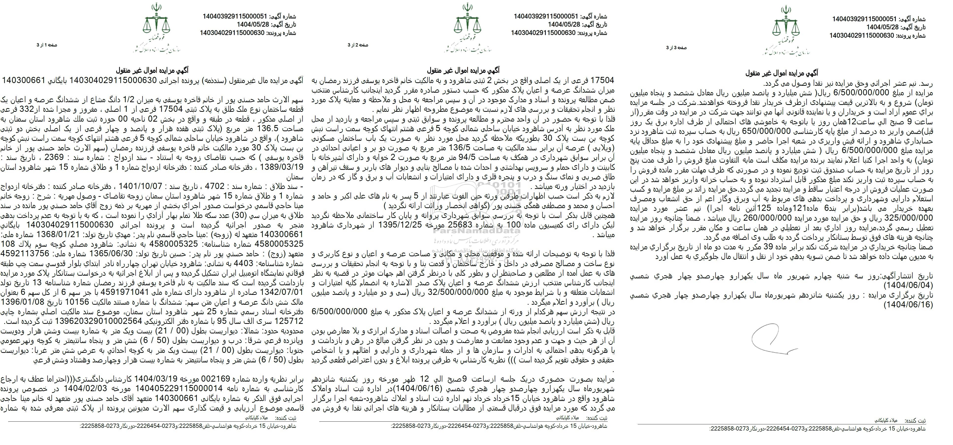 موضوع مزایده : ششدانگ عرصه و اعیان یک قطعه ساختمان به پلاک ثبتی 17504 فرعی از 1 اصلی مفروز و مجزی شده از 332 فرعی از اصلی مذکور به مساحت 136.5 مترمربع به ارزش 6.500.000.000 ریال