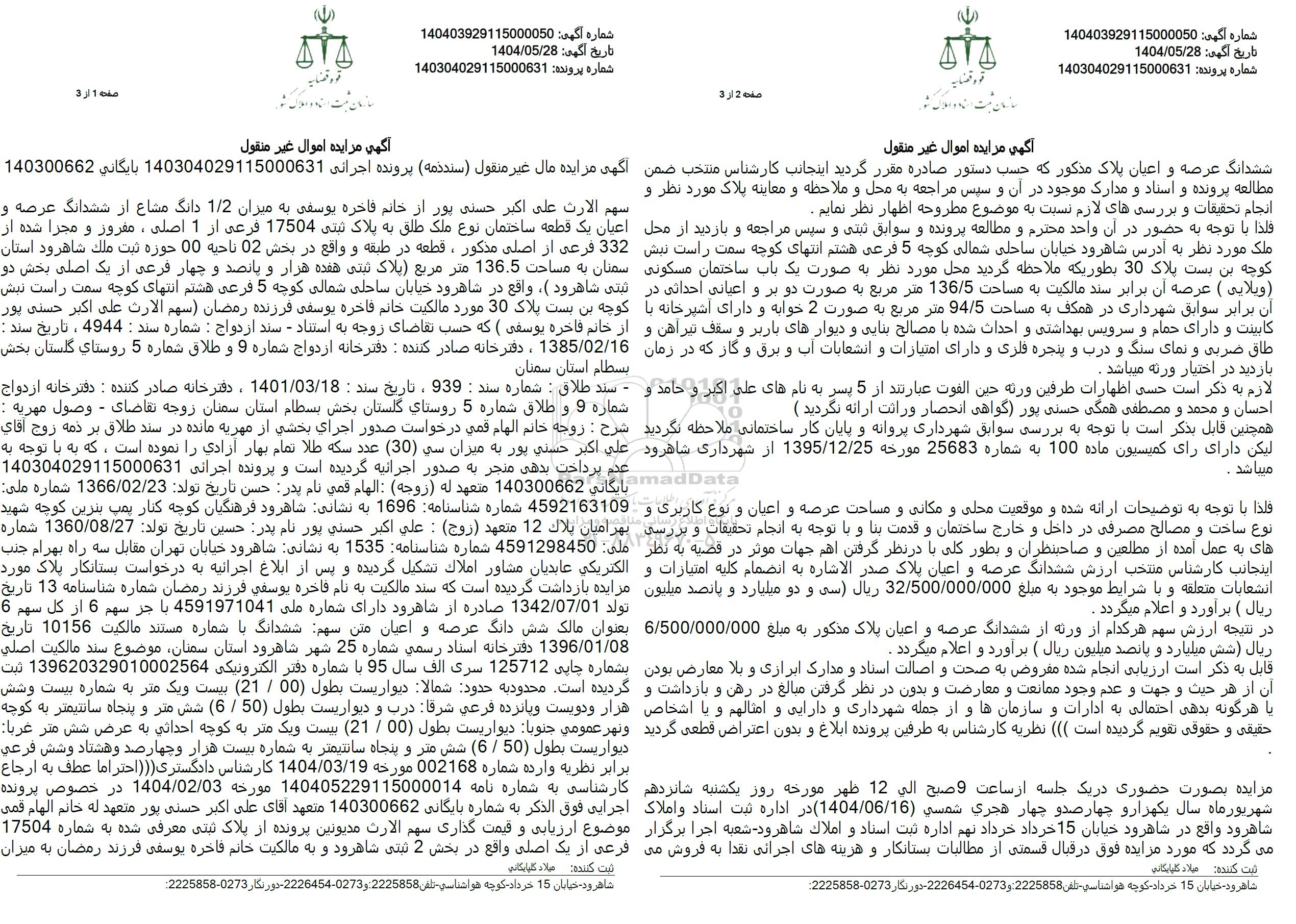 تاریخ مزایده : 1404.6.16 روز یکشنبه از ساعت 9 الی 12