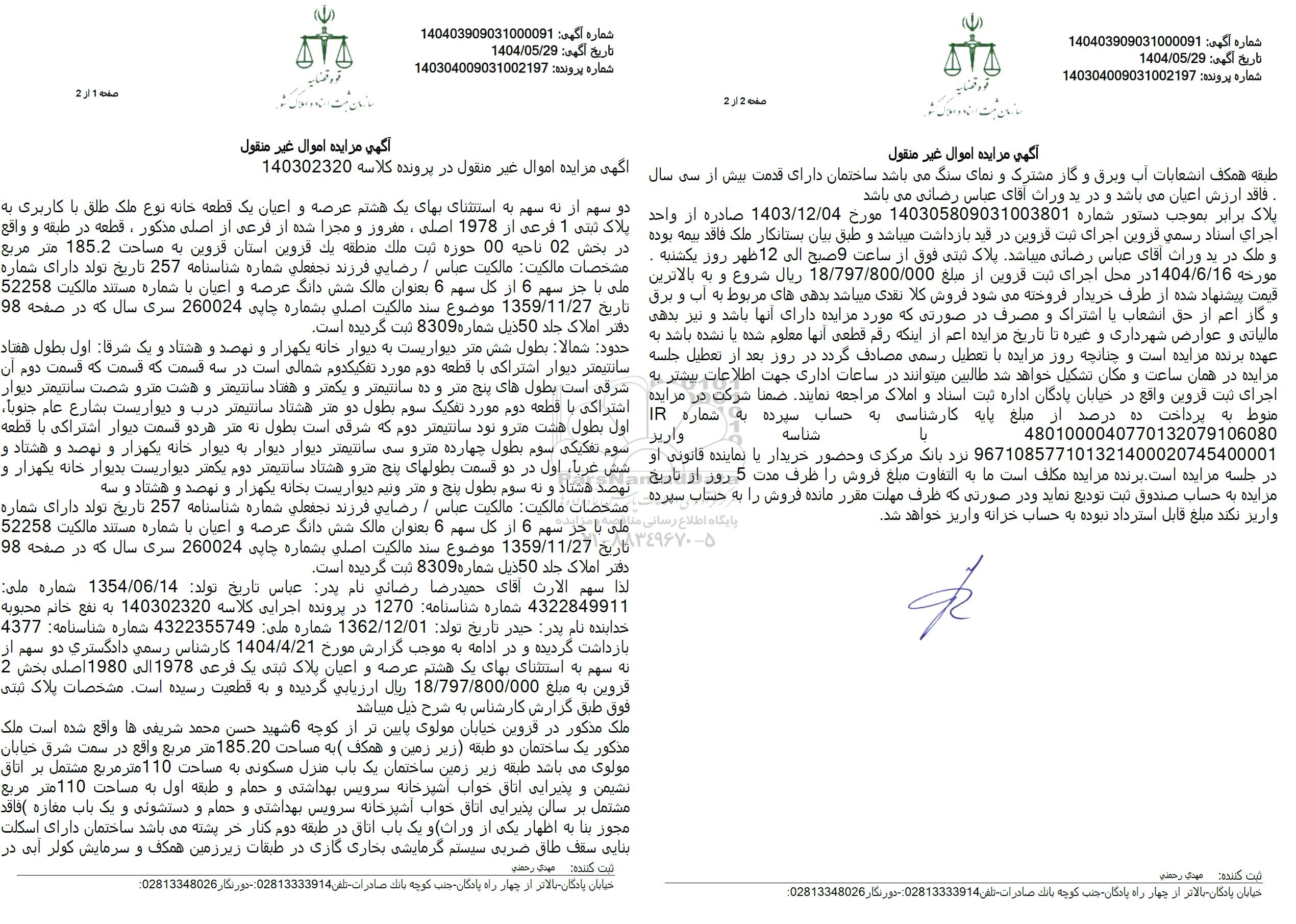موضوع مزایده : یک قطعه خانه تحت پلاک ثبتی 1 فرعی از 1978 اصلی، مفروز و مجزی شده از اصلی مذکور به مساحت 185.2 مترمربع به ارزش 18.797.800.000 ریال