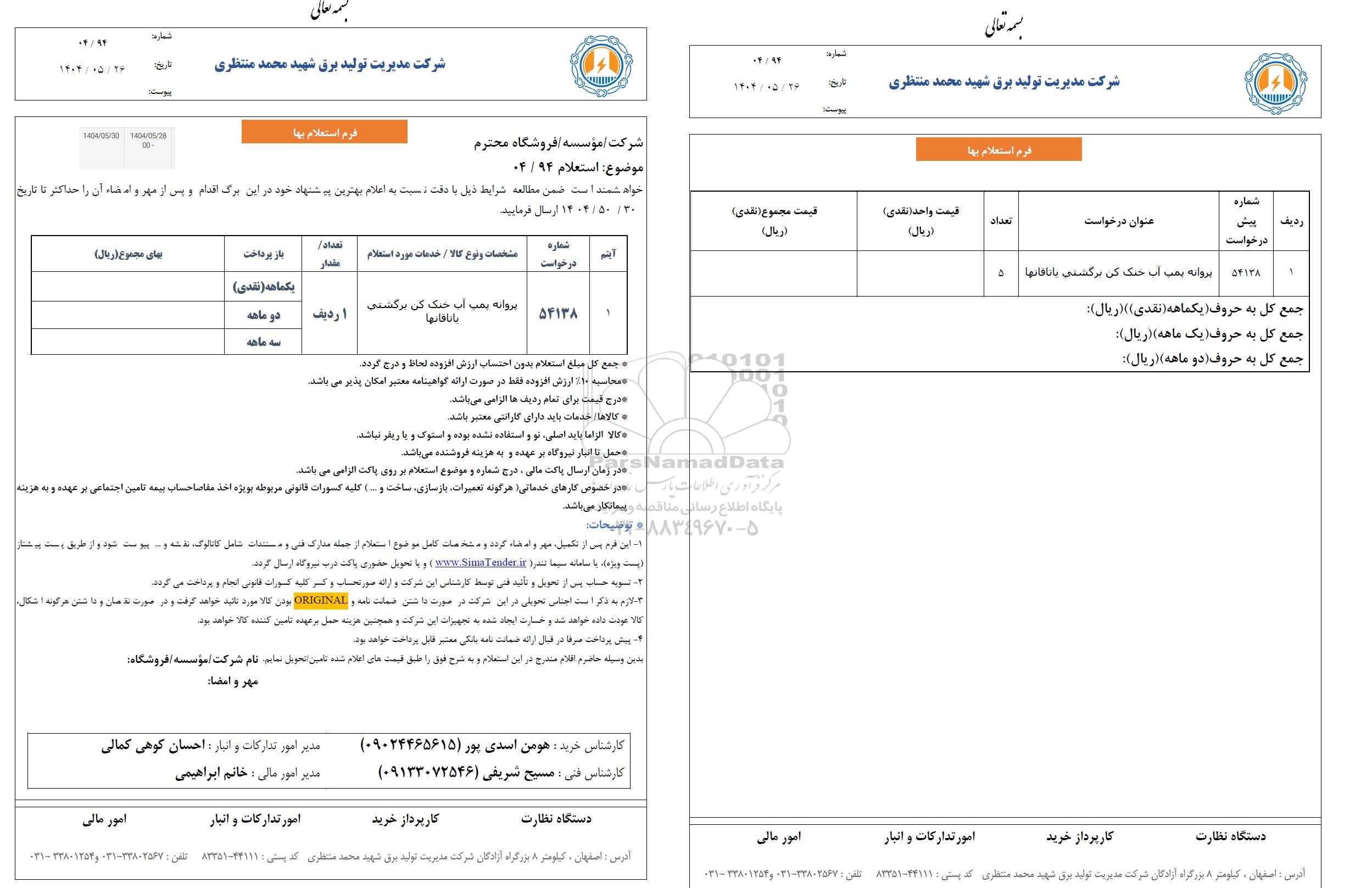 استعلام بها و موضوع استعلام استعلام پروانه پمپ آب خنک کن برگشتی یاتاقانها به اطلاع کلیه شرکت‌ها و افراد متخصص واجد شرایط می‌رساند، آگهی گذار در نظر دارد از طریق استعلام بها، نسبت به انتخاب و دریافت پیشنهادات اقدام نماید. این استعلام با کد آگهی ثبت شده در سامانه خبرگزاری پارس نماد : 9439026 منتشر شده است. مشخصات استعلام : تاریخ شروع استعلام: 1404/05/29 آخرین مهلت ارسال پیشنهاد قیمت : 1404/05/30 و محل اجرای پروژه : استان اصفهان میباشد. استعلام قیمت مورد درخواست : استعلام پروانه پمپ آب خنک کن برگشتی یاتاقانها با دسته‌بندی‌های تخصصی و گروه های مرتبط : الکتروموتور و پمپ های شناور, نیروگاه, تجهیزات برق و الکترونیک, استعلام اطلاع رسانی میگردد. شرایط شرکت در استعلام آنلاین : ابتدا ثبت نام در سامانه استعلام پارس نماد و تکمیل مدارک موردنیاز و بارگذاری در سامانه رعایت تمامی ضوابط و الزامات مندرج در اسناد استعلام است.