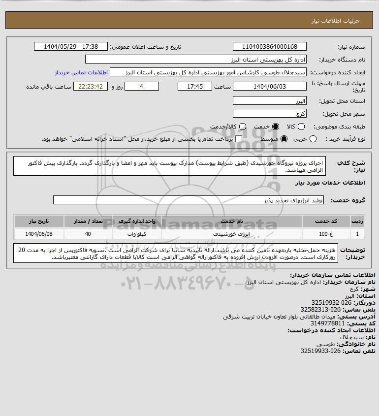 شرح کلی نیاز: اجرای پروژه نیروگاه خورشیدی (طبق شرایط پیوست) مدارک پیوست باید مهر و امضا و بارگذاری گردد. بارگذاری پیش فاکتور الزامی میباشد.