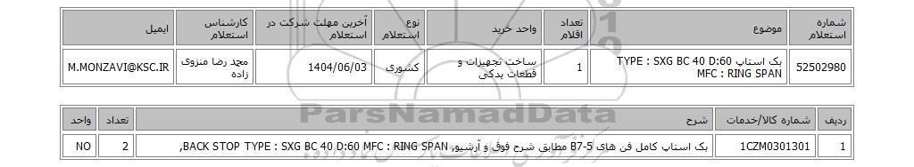 | 52502980 | بک استاپ TYPE : SXG BC 40 D:60 MFC : RING SPAN | 1 | ساخت تجهیزات و قطعات یدکی | کشوری | 1404/06/03 | محمد رضا منزوی زاده | M.MONZAVI@KSC.IR |
