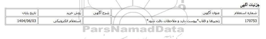 | 170753 | زنجیرها و قلاب*پیوست دارد و ملاحظات دقت شود* | استعلام الکترونیکی | 1404/06/03 |