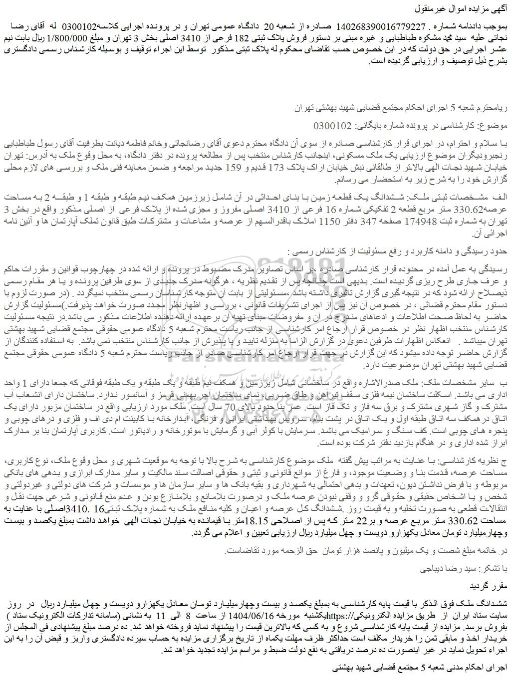 بموجب دادنامه شماره . 140268390016779227 صادره از شعبه 20 دادگاه عمومی تهران و در پرونده اجرایی کلاسه0300102 له آقای رضا نجاتی علیه سید محمد مشکوه طباطبایی و غیره مبنی بر دستور فروش پلاک ثبتی 182 فرعی از 3410 اصلی بخش 3 تهران و مبلغ 1/800/000 ریال بابت نیم عشر اجرایی در حق دولت که در این خصوص حسب تقاضای محکوم له پلاک ثبتی مذکور توسط این اجراء توقیف و بوسیله کارشناس رسمی دادگستری بشرح ذیل توصیف و ارزیابی گردیده است.