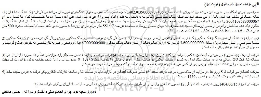شعبه دوم اجرای احکام مدنی شهرستان مراغه جهت اجرای دادنامه شماره 140230390006707406 شعبه ششم دادگاه عمومی حقوقی دادگستری شهرستان مراغه درنظردارد یک دانگ مشاع از یک خانه مسکونی متعلق به آقای بابا زارعی سعید آباد بخواسته محکومیت مدنی (حکم به پرداخت وجه نقد ) آقای محرم زارعی درحق آقای علی امیررضازاده با مشخصات ذیل  با شماره حراج 3004108583000067 را ازطریق انجام مزایده آنلاین در سامانه تدارکات الکترونیکی به آدرس سایت ستاد ایران به فروش برساند: 1) مورد مزایده عبارتست از یک دانگ از شش دانگ پلاک مذکور یک باب ساختمان واقع در اراضی روستای سعید اباد مشرف به میدان اصلی روستا با مساحت عرصه 551/17 متر مربع دارای زیربنا به صورت دو طبقه جمعا با مساحت حدودا 500 متر مربع بعلاوه انباری و  محل نگهداری احشام و امتیازات موجود می باشد .