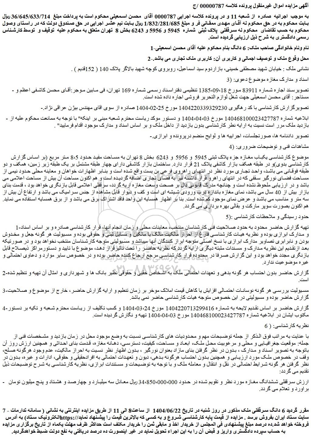 به موجب  اجرائیه  صادره  از شعبه 11 و در پرونده کلاسه اجرایی 0000787 آقای  محسن اسمعیلی محکوم است به پرداخت مبلغ  36/645/633/714 ریال بابت محکوم به در حق محکوم له آقای مهدی ممقانی فر و مبلغ 1/832/281/685 ریال بابت نیم عشر اجرایی در حق صندوق دولت که در راستای وصول محکوم به حسب تقاضای  محکوم له سرقفلی  پلاک ثبتی  شماره  5945 و 5956 و 6243 بخش 8  تهران متعلق به محکوم علیه  توقیف و  توسط کارشناس رسمی دادگستری به شرح ذیل ارزیابی گردیده است.