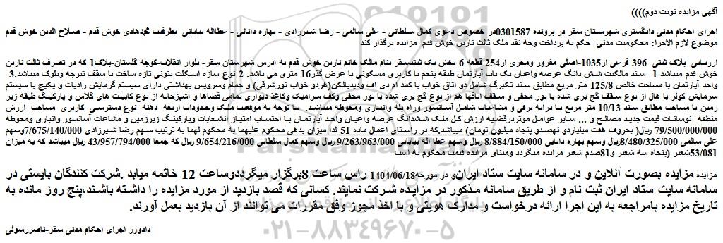 اجرای احکام مدنی دادگستری شهرستان سقز در پرونده 0301587در خصوص دعوی کمال سلطانی - علی سالمی - رضا شیرزادی - بهاره دانائی - عطااله بیابانی بطرفیت محمدهادی خوش قدم - صلاح الدین خوش قدم موضوع لازم الاجرا: محکومیت مدنی- حکم به پرداخت وجه نقد ملک ثالث نارین خوش قدم مزایده برگذار کند